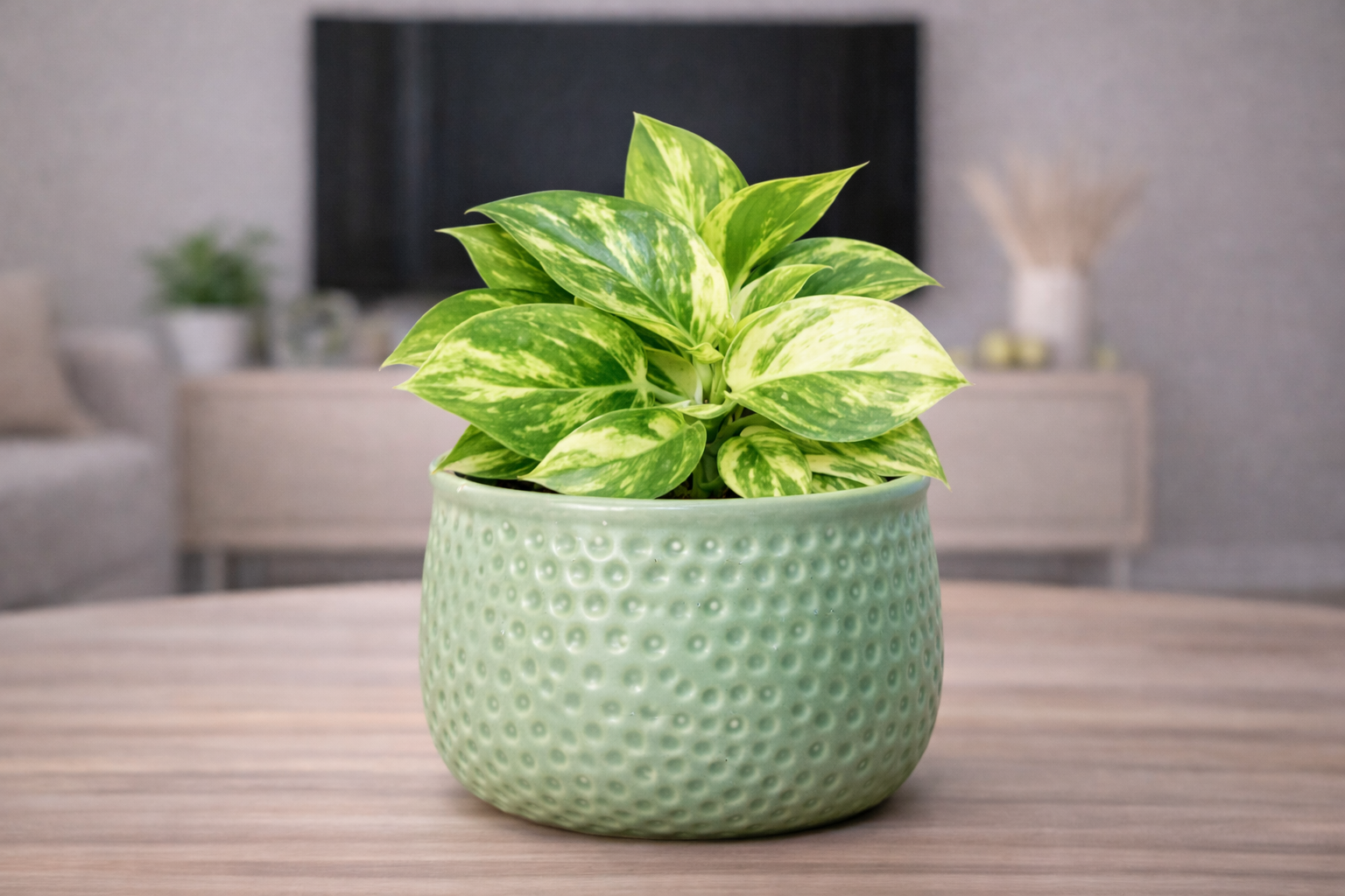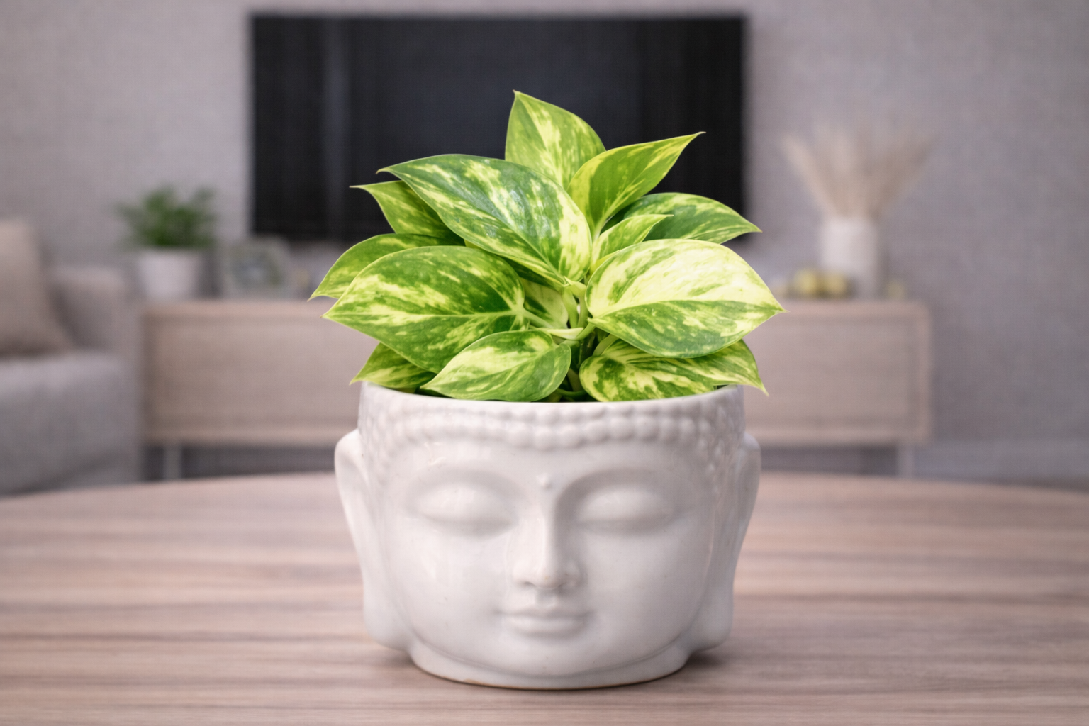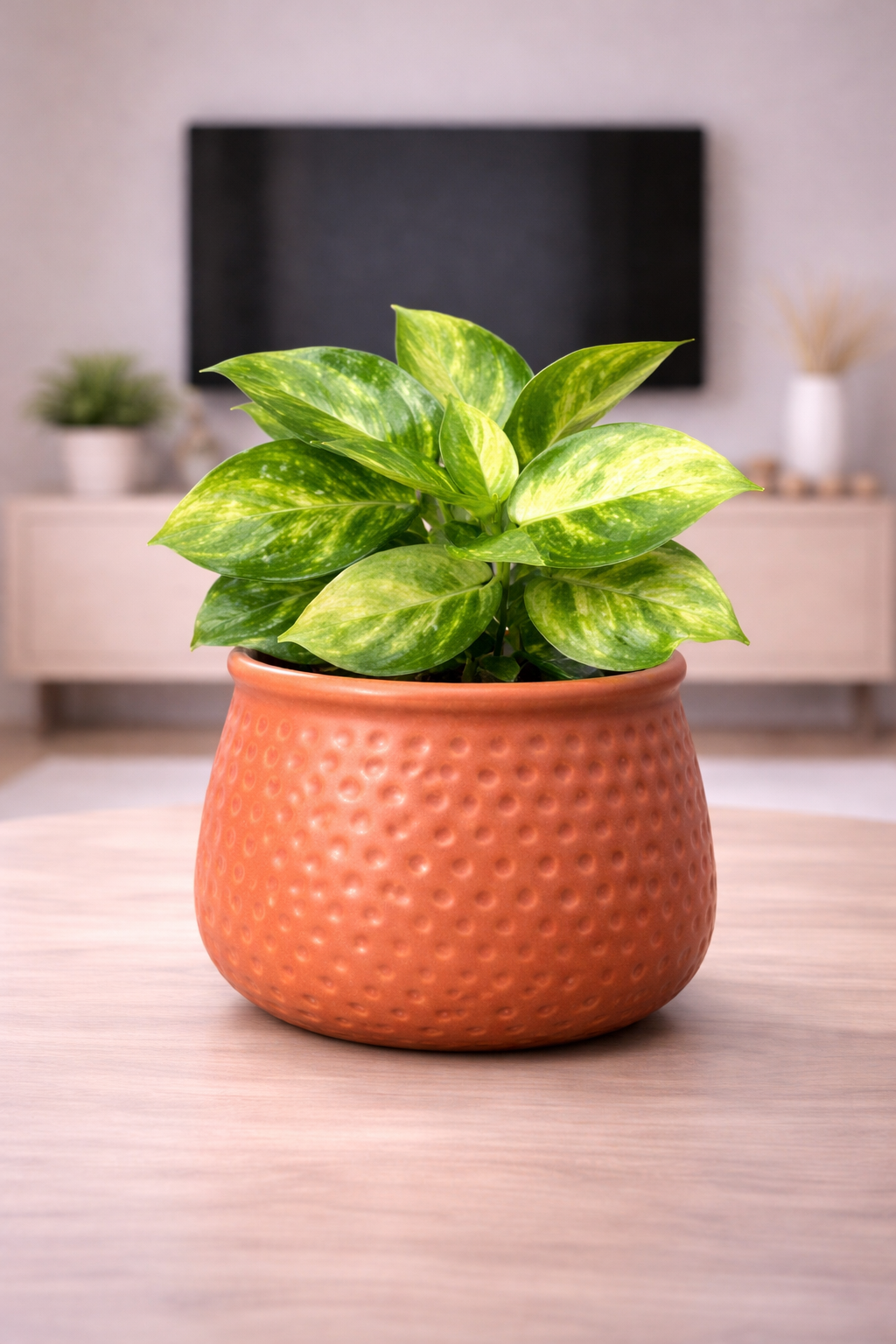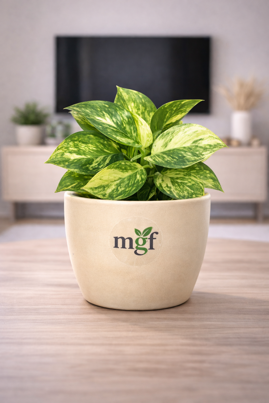 The Money Plant (Pothos) is a popular and resilient indoor plant known for its heart-shaped leaves and lush trailing growth. Carefully grown and nurtured, this live plant is potted in a premium ceramic planter with decorative top stones, making it a perfect blend of natural charm and modern elegance.