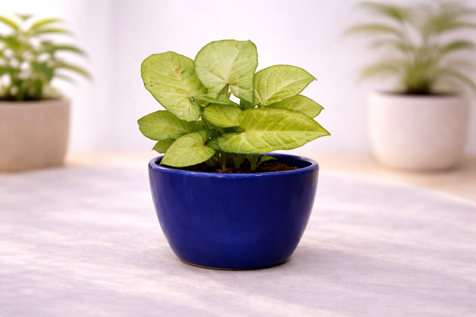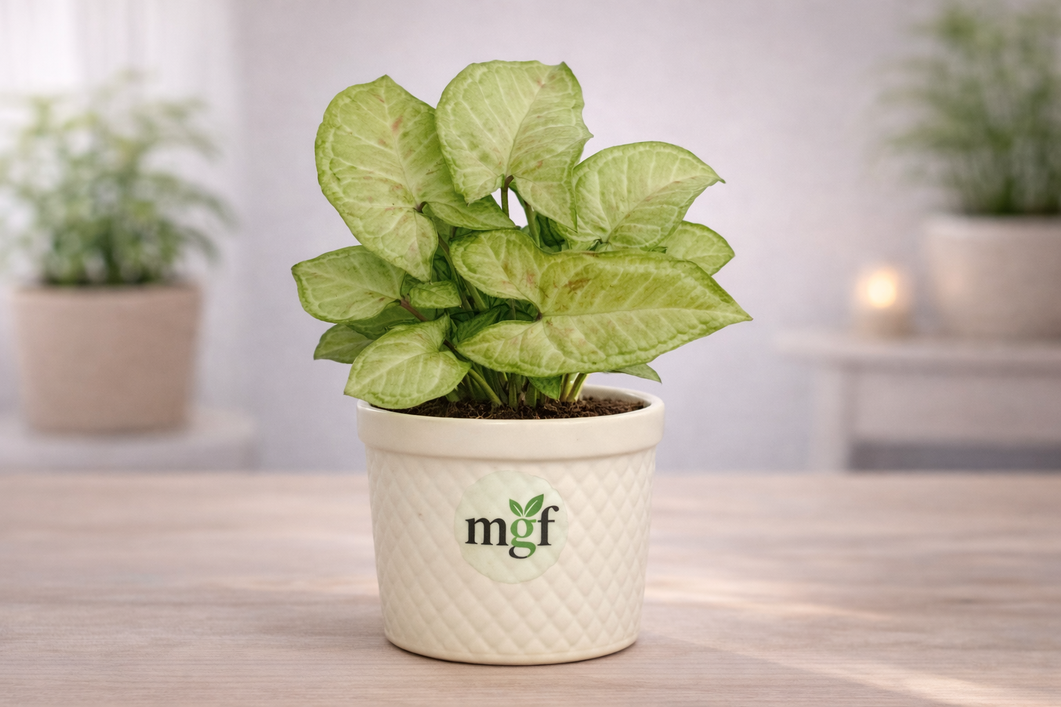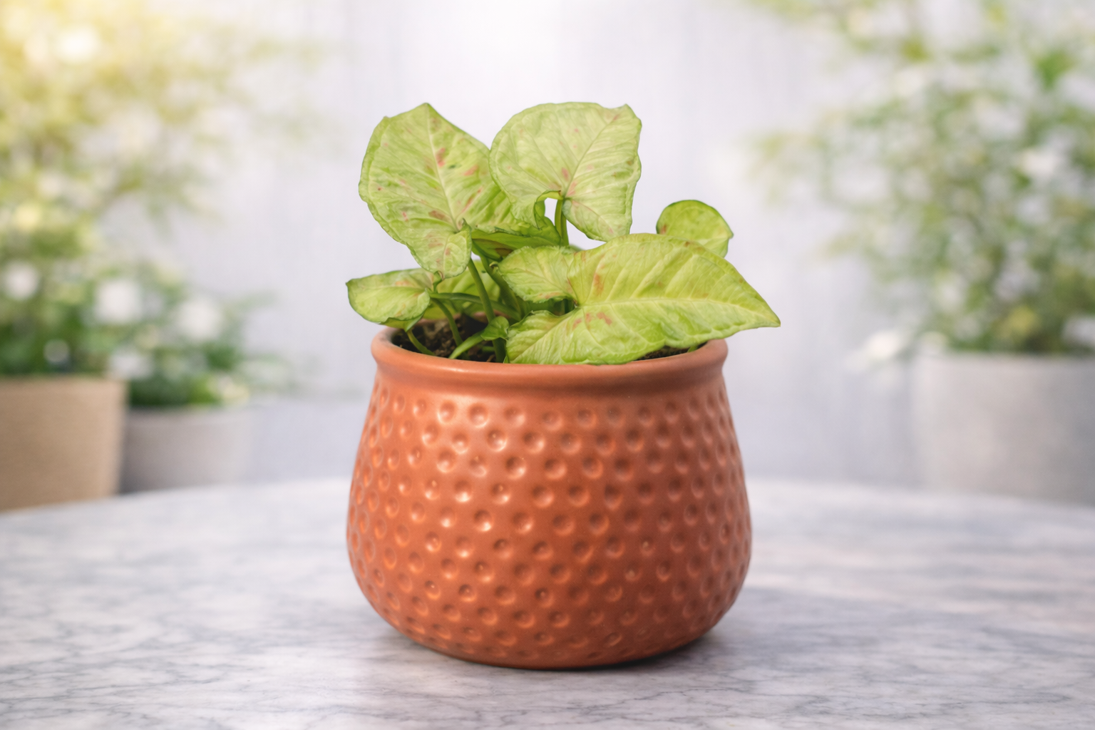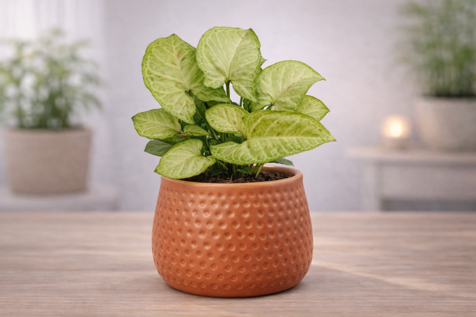 Syngonium helps improve indoor air quality by filtering common toxins and increasing humidity. It contributes to a cleaner, healthier environment and creates a calming atmosphere in homes and offices.