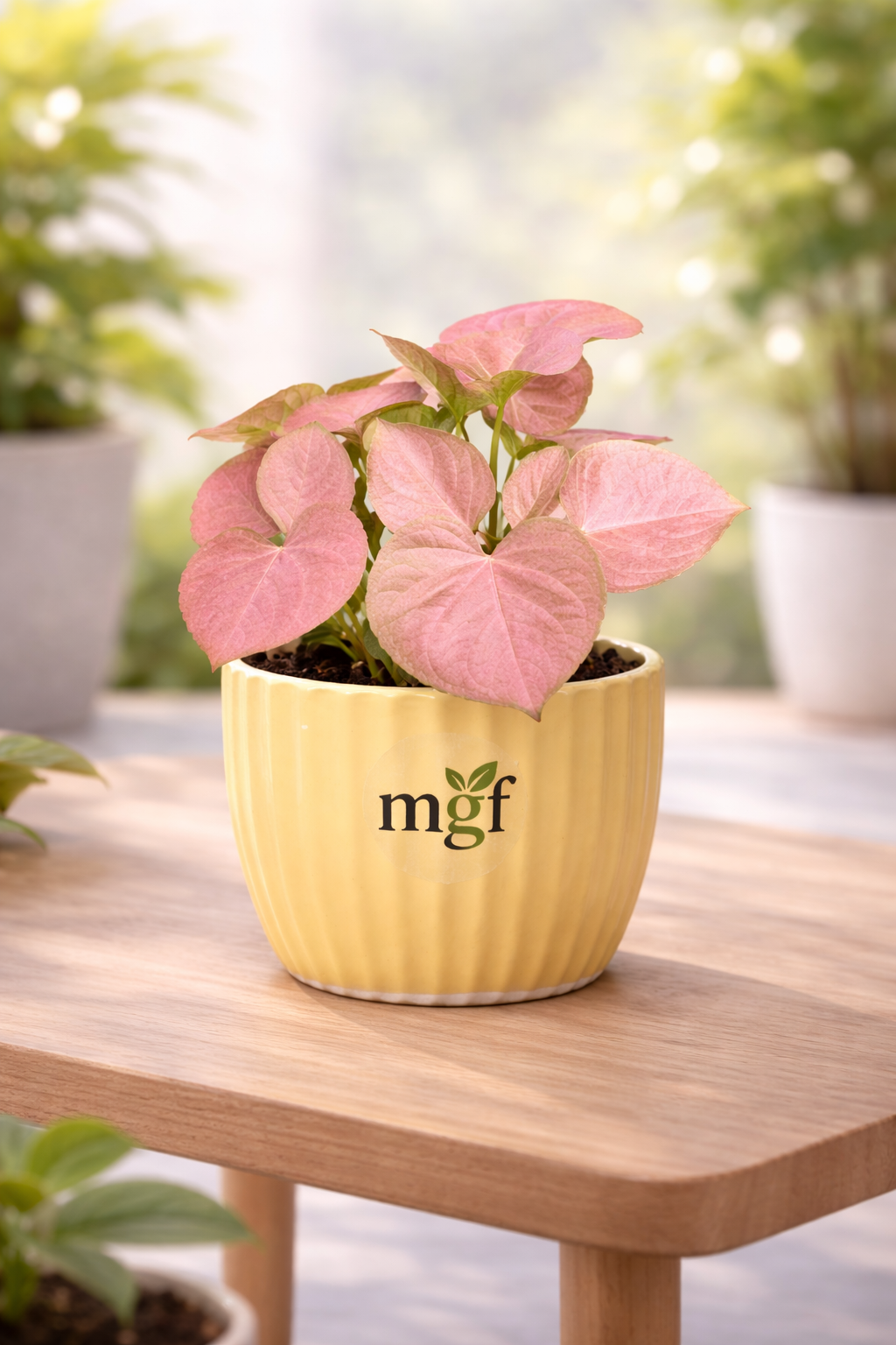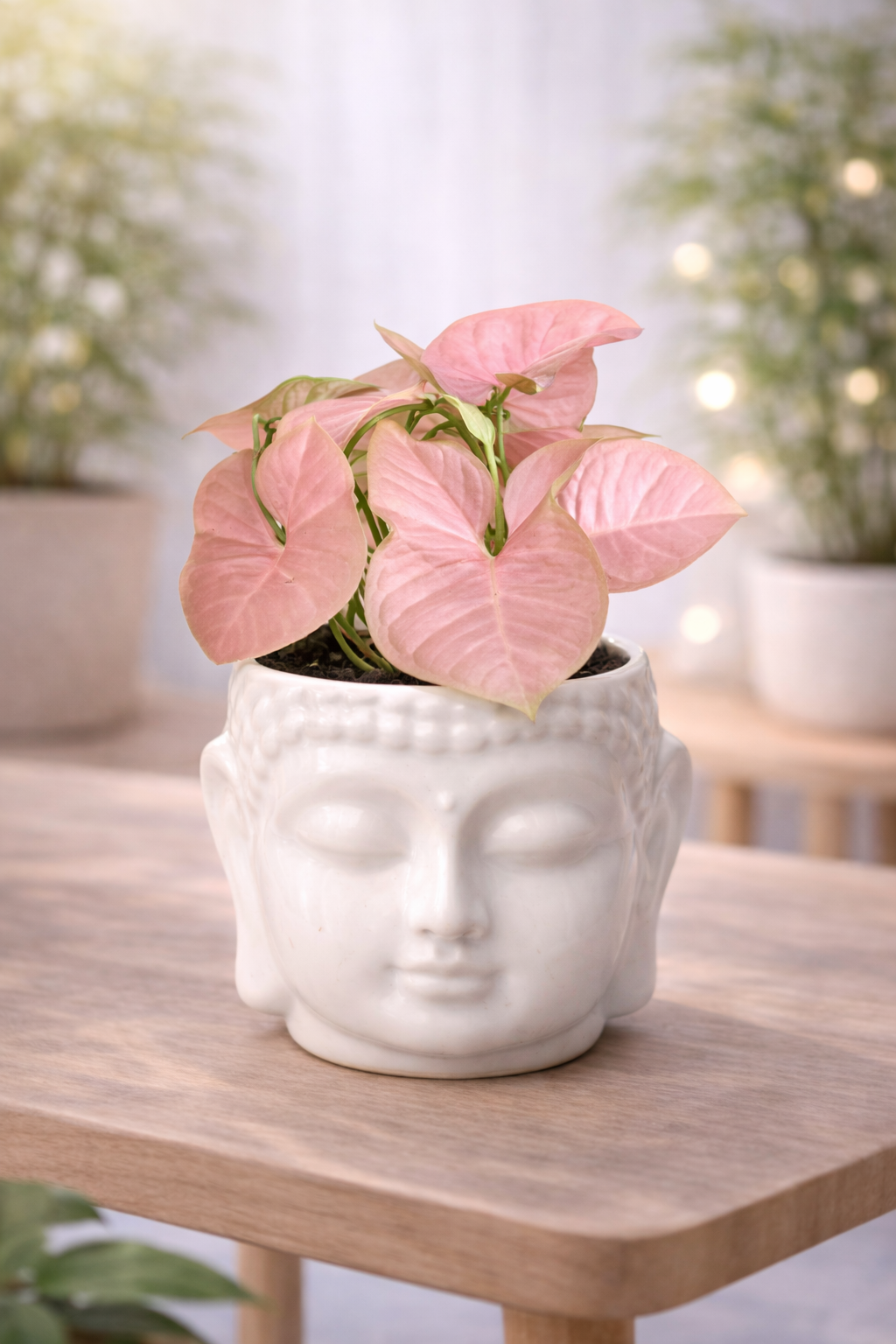 The Syngonium (Arrowhead Plant) is a graceful, fast-growing indoor plant known for its attractive arrow-shaped leaves and vibrant foliage. Carefully grown and nurtured, this live plant is potted in a premium ceramic planter with decorative top stones, making it a perfect blend of natural beauty and modern elegance.