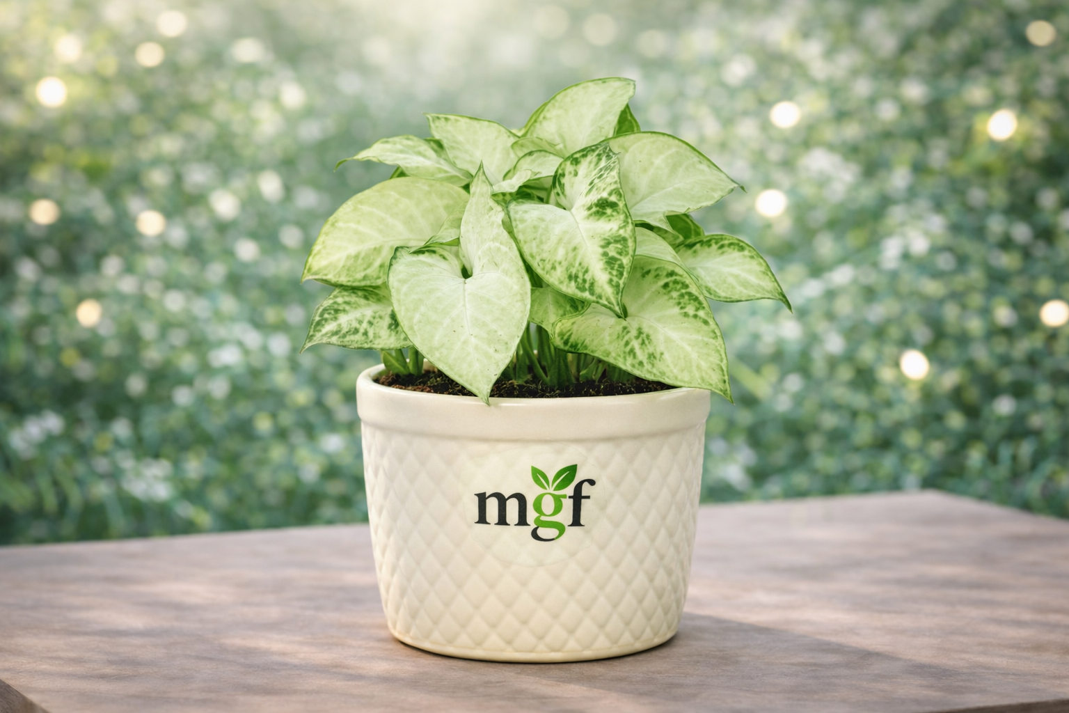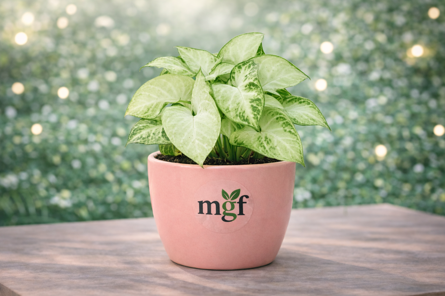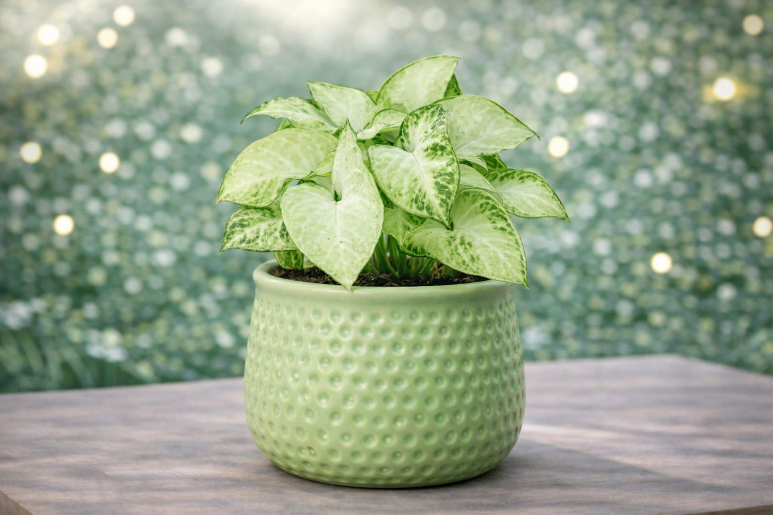 The Syngonium (Arrowhead Plant) is a graceful, fast-growing indoor plant known for its attractive arrow-shaped leaves and vibrant foliage. Carefully grown and nurtured, this live plant is potted in a premium ceramic planter with decorative top stones, making it a perfect blend of natural beauty and modern elegance.